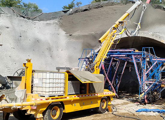 混凝土濕噴機的工作原理是將水泥、水和骨料按設計比例拌和均勻,用濕噴機壓送到噴頭處,再在噴頭處添加液壓速凝劑并與壓縮空氣混合后噴射到受噴面上,形成混凝土支護層。